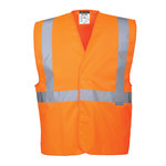 Portwest high visibility polyester safety vest. Non-Mesh. One reflective band around chest with reflective tape over each shoulder. 3.5 oz. warp knit polyester. Meets all standards for ANSI/ISEA 107 and EN ISO 20471. Offered in high viz orange and safety green yellow.