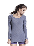 Long sleeve scoop neck. Modern fit in feminine contour. A technical blend of micropoly with the natural, soft hand of cotton and the luxury drape of rayon. Fashionable and functional. Inherent moisture wicking. Tear away label. TriTec