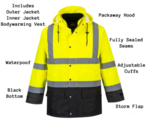 Portwest is the biggest name in safety apparel in Europe and now available in the USA. This innovative waterproof 5-in-1 jacket adapts for all your seasonal needs. The system converts from full use as a waterpoof, stain resistant, PU coated, 5.5 oz 100% polyester outer shell; with a 2 oz. polyester inner mesh lining storm jacket that is nested to an 8.5 oz thermal polyeester fleece jacket that has detachable sleeves for converting to a vest. This inner jacket attaches internally to the sleeves of the outer storm jacket for superior comfort and protection in all weather conditions. Features 7 pockets. Outer shell features 2 Storm flapped lower patch pockets, 1 phone/radio under storm flap and 1 inner left chest. Inner jacket has 2 lower front pockets and 1 interal patch pocket. Both jackets have internal access for decorating with your logo. If you have not field tested Portwest now is the time to do so. This 5-in1 is far superior in waterproofing and certifed to meet all your ANSI/ISEA 107-2015 Type R CLASS 3 needs for a quality reflective hi-viz jacket. EN ISO 20471 CLASS 3; EN 343 CLASS 3:1